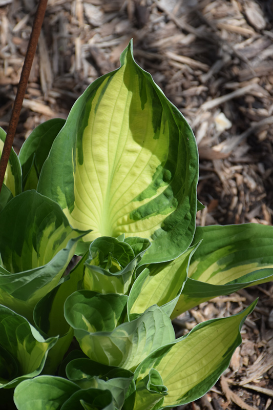 Deep green margins surround creamy white centers in spring that mature to light green then finally dark green in late summer; spikes of pale lavender flowers in mid to late summer; a whirlwind of change in the garden or border