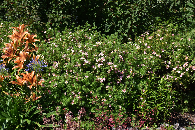 Pink Beauty Potentilla will grow to be about 30 inches tall at maturity, with a spread of 3 feet. It tends to fill out right to the ground and therefore doesn't necessarily require facer plants in front. It grows at a slow rate, and under ideal conditions can be expected to live for approximately 30 years.