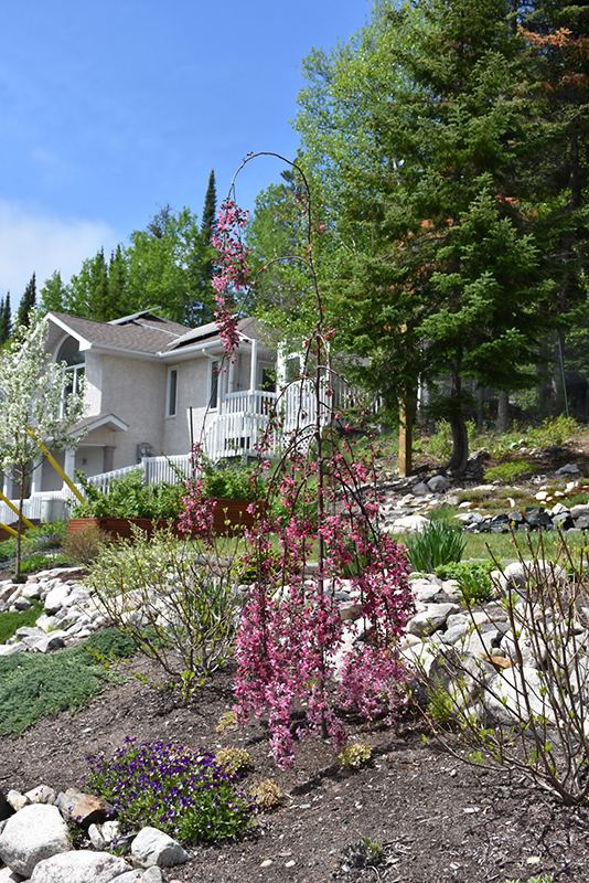 A hardy weeping flowering crab with cascading purple foliage and showy pink flowers in spring followed by small dark red fruit; exceptionally effective as a feature ornamental in a mixed garden composition, needs well-drained soil and full sun