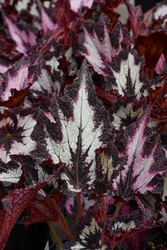 Jurassic Silver Point Begonia's attractive large twisted heart-shaped leaves remain silver in colour with distinctive black edges and tinges of rose throughout the year on a plant with an upright spreading habit of growth.