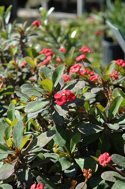 Crown Of Thorns features showy clusters of green flowers with red bracts held atop the branches from early spring to late fall. Its attractive oval leaves emerge light green, turning green in colour throughout the year.