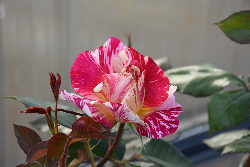A stunning hybrid tea rose featuring large, paint splashed, red and white blooms with golden-orange centers; short and compact with excellent disease resistance; an excellent cut flower