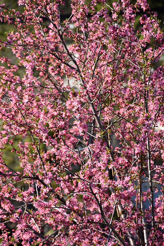Muckle Plum is covered in stunning clusters of lightly-scented hot pink flowers along the branches in early spring, which emerge from distinctive cherry red flower buds before the leaves. It has dark green deciduous foliage. The pointy leaves turn an outstanding orange in the fall. The smooth black bark adds an interesting dimension to the landscape.