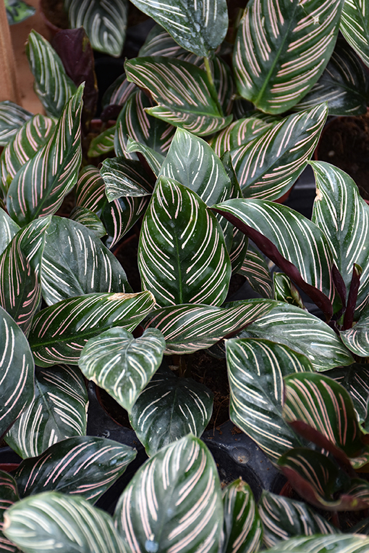 When grown indoors, Pinstripe Calathea can be expected to grow to be about 3 feet tall at maturity, with a spread of 3 feet. It grows at a slow rate, and under ideal conditions can be expected to live for approximately 5 years. This houseplant performs well in both bright or indirect sunlight and strong artificial light, and can therefore be situated in almost any well-lit room or location. It does best in average to evenly moist soil, but will not tolerate standing water. The surface of the soil shouldn't be allowed to dry out completely, and so you should expect to water this plant once and possibly even twice each week. Be aware that your particular watering schedule may vary depending on its location in the room, the pot size, plant size and other conditions; if in doubt, ask one of our experts in the store for advice. It will benefit from a regular feeding with a general-purpose fertilizer with every second or third watering. It is not particular as to soil pH, but grows best in rich soil. Contact the store for specific recommendations on pre-mixed potting soil for this plant.