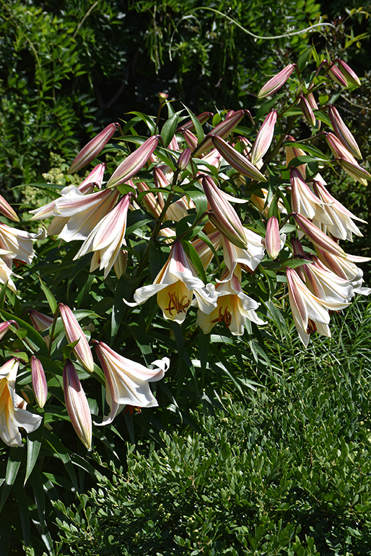 A midsummer bloomer producing tall, sturdy stems topped with highly fragrant, white trumpeted blooms with golden yellow throats and flushed with purple on the outside; long lasting flower display, great for borders, containers or fresh cut flower bouquets