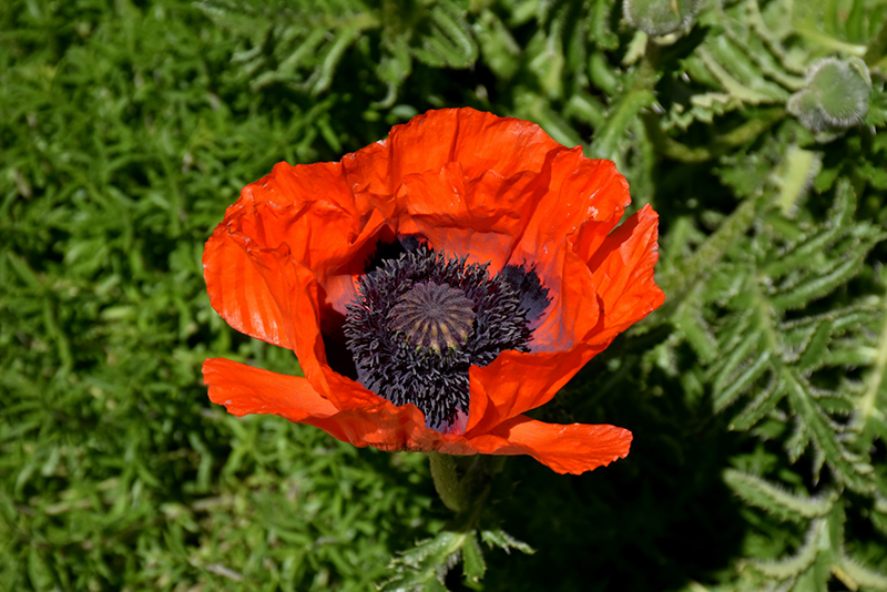 Beauty of Livermere Poppy features bold red round flowers with burgundy eyes and black centers at the ends of the stems from early to mid summer. The flowers are excellent for cutting. Its deeply cut ferny leaves remain forest green in colour throughout the season.